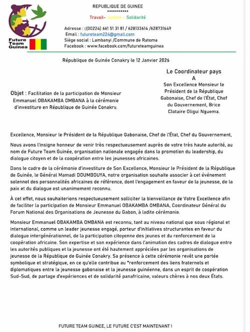 Dans ce contexte de haute portée institutionnelle, Emmanuel Obakamba Ombana, Coordonnateur général du Forum National des Organisations de Jeunesse du Gabon, a été officiellement convié à prendre part à cet événement par Monsieur Thierno Souleymane Diallo, Coordinateur pays de Future Team Guinée-Conakry, organisation de référence engagée aux côtés des autorités guinéennes dans l’accompagnement des politiques publiques en faveur de la jeunesse et du développement national.