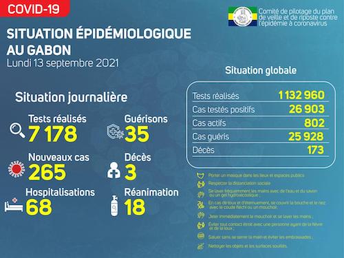 Nous avons enregistré 265 nouveaux cas positifs sur 7 178 tests réalisés, soit un taux de positivité de 3.7%, 68 personnes hospitalisées dont 18 en réanimation pour détresse respiratoire, 35 nouvelles guérisons et 03 nouveaux décès à Libreville.