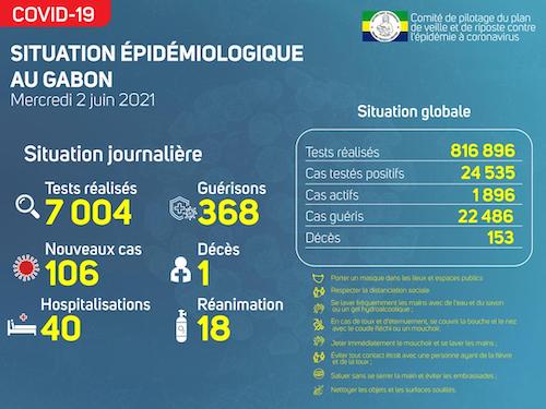 Nous avons enregistré 106 nouveaux cas positifs sur 7 004 tests réalisés, soit un taux de positivité de 1.5%, 40 personnes hospitalisées dont 18 en réanimation pour détresse respiratoire, 368 nouvelles guérisons et 01 nouveau décès à Port Gentil.