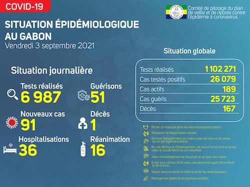 Nous avons enregistré 91 nouveaux cas positifs sur 6 987 tests réalisés, soit un taux de positivité de 1.3%, 36 personnes hospitalisées dont 16 en réanimation pour détresse respiratoire, 51 nouvelles guérisons et 01 nouveau décès à Libreville.