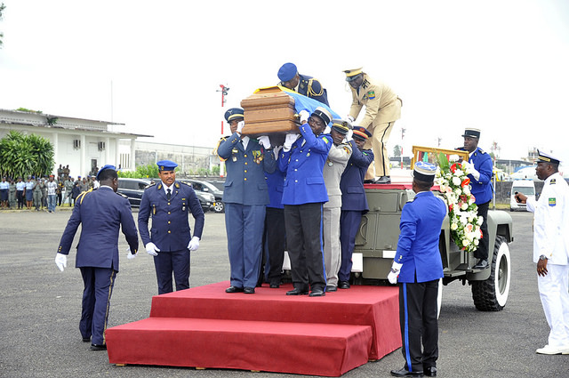 Au deuxième jour de l’hommage national dédié à Rose Francine Rogombé, Ali Bongo Ondimba a présidé la cérémonie au cours de laquelle furent rendus les honneurs funèbres militaires. Sur la base aérienne 01, les troupes arrêtées au garde-à-vous sous un ciel de tristesse pluvieuse formaient un décor de circonstance pour le dernier voyage d’une femme d’État dont la vie restera « un modèle de courage, de sagesse et d’amour pour notre pays ».