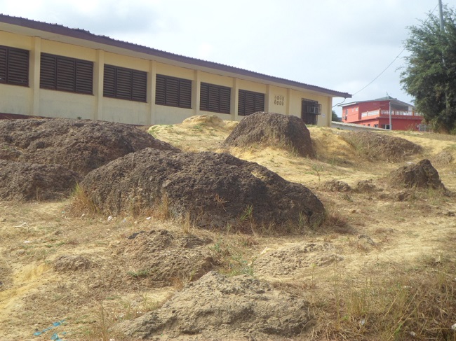 La cour de récréation est parsemée de gros cailloux qui semblent sortir de terre au fil des pluies. Vu l’ampleur de la poussière, il est possible que les élèves pataugent dans de la boue en période pluvieuse.