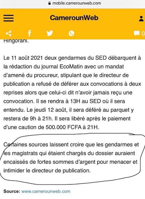 https://mobile.camerounweb.com/CameroonHomePage/NewsArchive/Le-journal-EcoMatin-d-termin-publier-l-enqu-te-sur-le-blanchiment-d-argent-d-un-homme-d-affaires-indien-au-Cameroun-615721 où Emile Fidieck Le directeur d’ECOMATIN l’a encore répété dans son interview et a mis quelques allégations choquantes et non prouvées de "Corruption" sur Gendarmes & aux système Judiciaire Camerounais. (Se référer au dernier paragraphe de cet article)