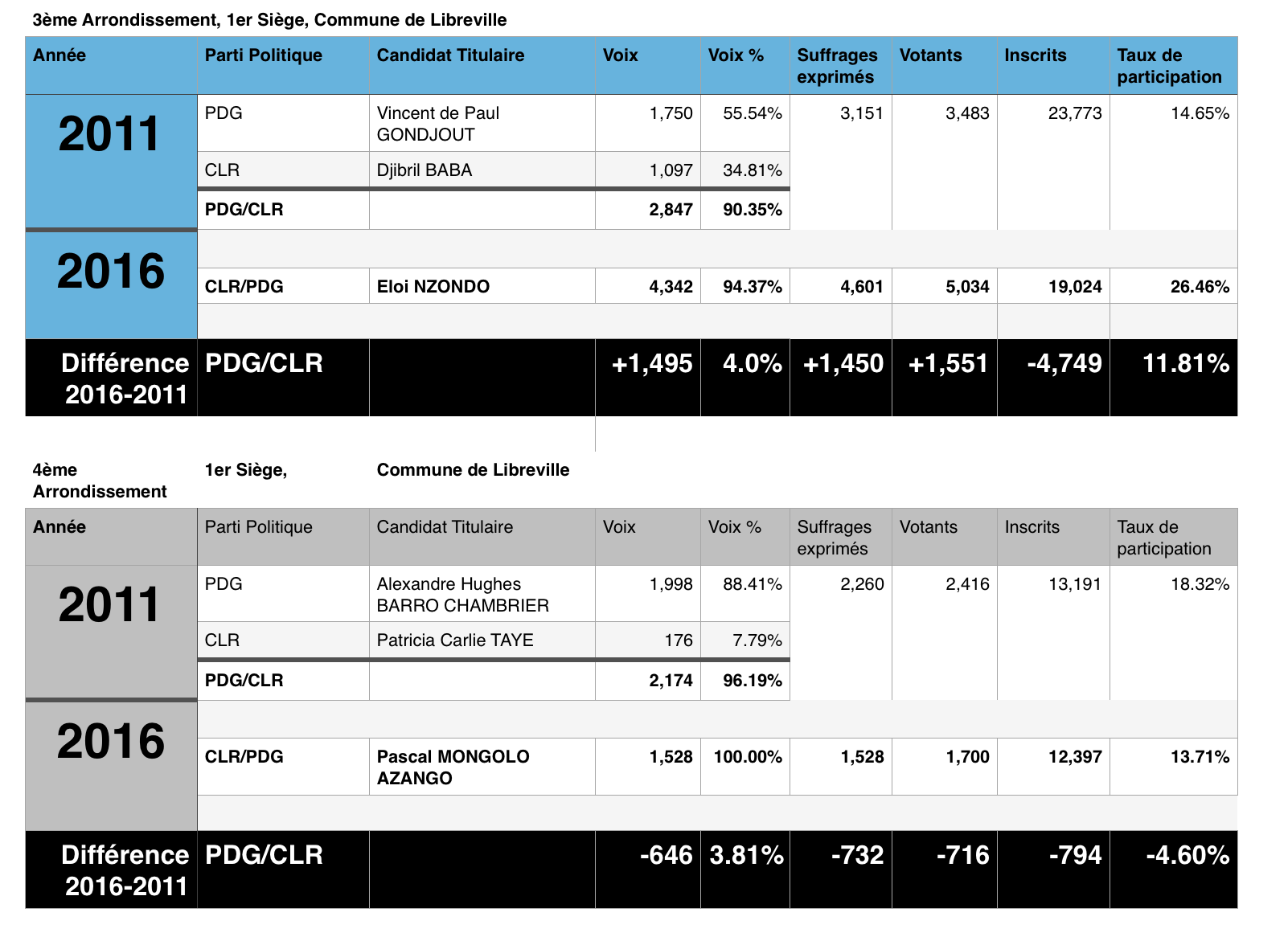 Cependant, une légère baisse de 34% en moyenne est observée au 1er siège du 4ème Arrondissement. En 2011, le taux de participation était de 18,32% avec 13.191 inscrits pour 2.260 suffrages exprimés. Le PDG représenté par Alexandre Hughes BARRO CHAMBRIER (désormais au Rassemblement Héritage et Modernité) avait obtenu 1.998 voix (soit 88.41%). Aux élections partielles du 18 Juin 2016, bien qu’en baisse l’alliance PDG/CLR obtient tout de même 1.528 voix (soit 100%). Une baisse qui semble être justifié par la baisse du nombre de suffrages exprimés avec 1.528 voix (soit une baisse de 732 voix), soit une perte 470 électeurs seulement.