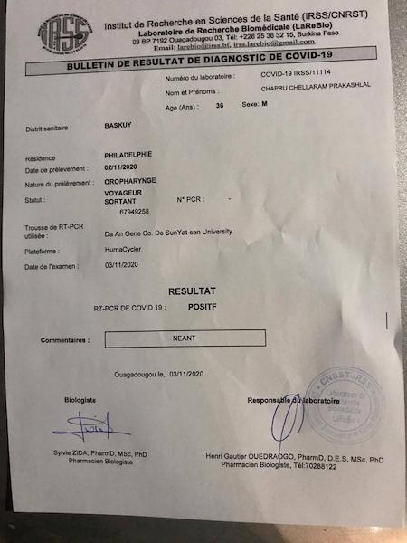 12ème preuve- Une photo de ses résultats positifs au test Covid-19 à Ouagadougou.