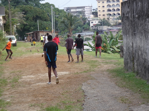 La question d’espace de jeu public se pose toujours à Libreville. C’est le cas des Hauts de Gué Gué où les vacanciers profitent d’une aire de fortune pour en faire un terrain de football.