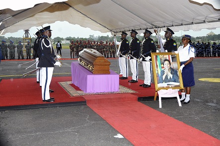 Au deuxième jour de l’hommage national dédié à Rose Francine Rogombé, Ali Bongo Ondimba a présidé la cérémonie au cours de laquelle furent rendus les honneurs funèbres militaires. Sur la base aérienne 01, les troupes arrêtées au garde-à-vous sous un ciel de tristesse pluvieuse formaient un décor de circonstance pour le dernier voyage d’une femme d’État dont la vie restera « un modèle de courage, de sagesse et d’amour pour notre pays ».