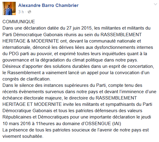 Communiqué de Héritage et Modernité retrouvé sur la page Facebook de l’honorable Alexandre Barro CHAMBRIER, appelant à un rassemblement ce jeudi 10 Mars 2016 à Ossengue (Libreville Sud), ouvert à tous les "Patriotes".