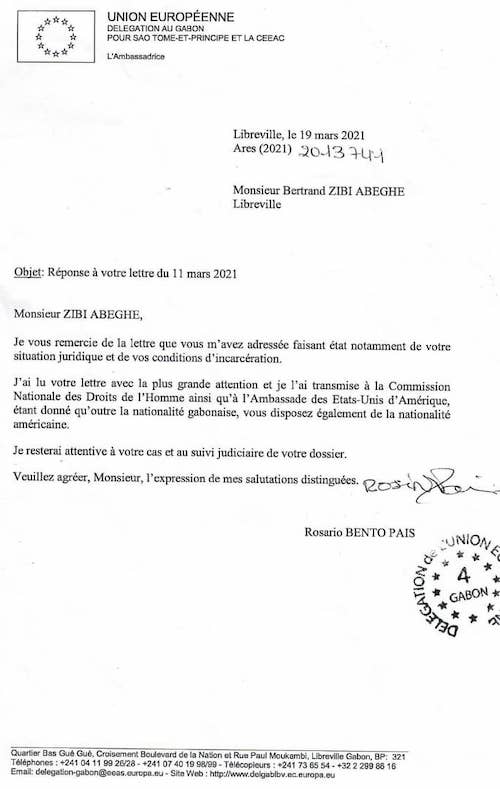 En prélude à son dernier courrier du 11 mars 2021, adressé, depuis la prison centrale de Libreville, à la représentante de la Délégation de l’Union Européenne au Gabon, Bertrand Zibi Abeghe, prisonnier politique, a finalement obtenu un retour « direct » de Rosario Bento País sur la question de sa situation juridique et de ses conditions d’incarcération.