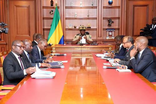 Général Brice Clotaire Oligui Nguema a échangé ce jour avec Monsieur Carlos Maxime Mevi, Directeur général d’Orabank qu’accompagnaient messieurs Ludovic Megne Ndong et Mays Mouissi, respectivement ministres de l’Habitat, de l‘Urbanisme, du Cadastre, et de l’Economie et des participations.