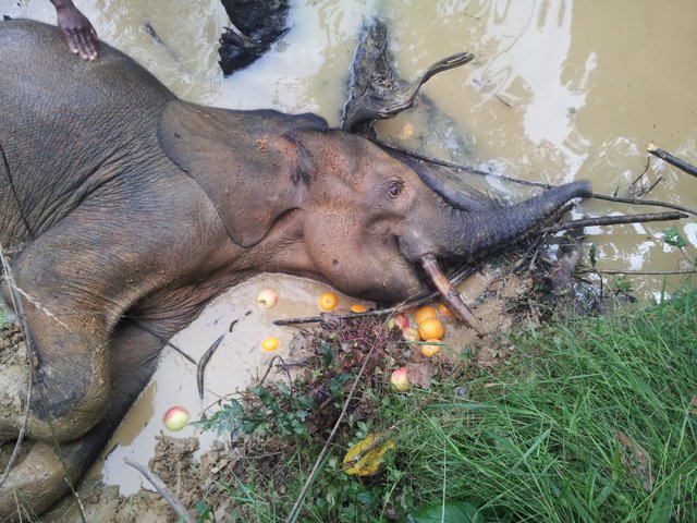 L’éléphant qui a été découvert coincé dans la boue dans une concession forestière depuis jeudi dernier a finalement succombé.