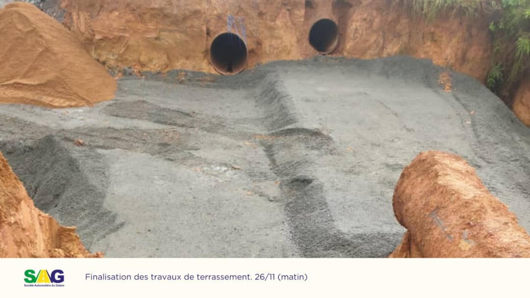 La Société autoroutière du Gabon (SAG) et son prestataire AFCONS ont finalisé ce dimanche matin 26 novembre les travaux de la plate-forme routière. Un lit de sable a été mis en place pour que la SEEG, à travers son sous-traitant ETE, puisse commencer la pose de la nouvelle conduite.