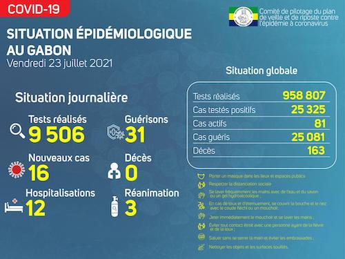 Nous avons enregistré 16 nouveaux cas positifs sur 9 506 tests réalisés, soit un taux de positivité de 0.1%, 12 personnes hospitalisées dont 03 en réanimation pour détresse respiratoire, 31 nouvelles guérisons et 00 nouveau décès.