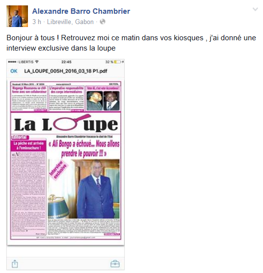 Dans une édition spéciale du journal la loupe, l’honorable Alexandre Barro Chambrier (PDG Héritage et Modernité), a donné une interview exclusive partagée sur sa page Facebook : "Bonjour à tous ! Retrouvez moi ce matin dans vos kiosques , j’ai donné une interview exclusive dans la loupe". Voici l’intégralité de son entretien.