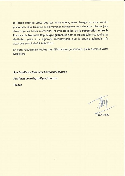 GABON /FRANCE : Jean PING félicite Emmanuel MACRON