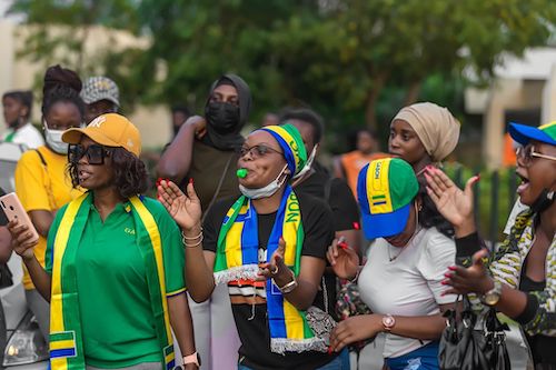 Le comité d’accueil exceptionnel a arboré des écharpes, des banderoles , des tee shirts aux trois couleurs du pays. Les supporters des Panthères du Gabon ont esquissé des pas de danses pour rendre honneur à leur équipe le tout retransmis en direct sur Facebook avec plus de 10 milles personnes connectées.